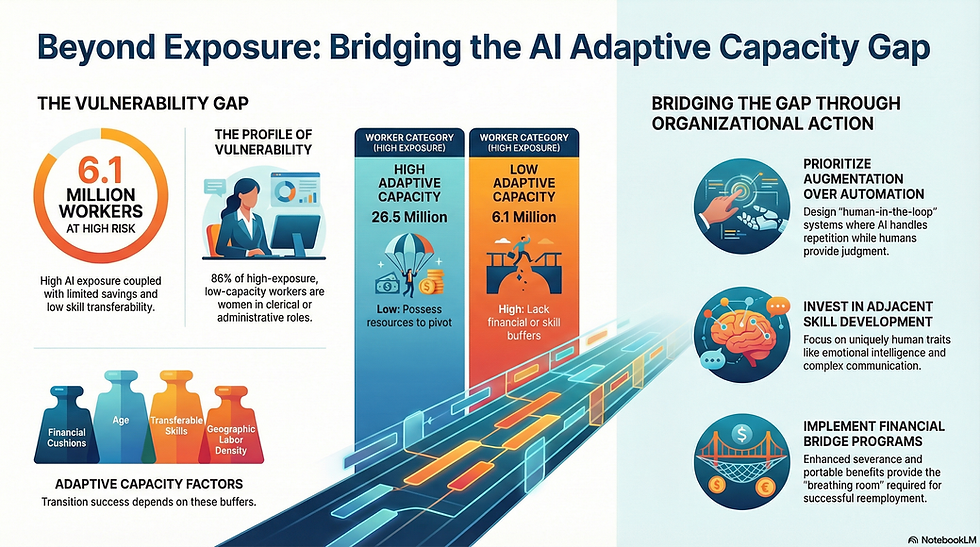 Abstract: Artificial intelligence (AI) is reshaping labor markets worldwide, yet most analyses focus narrowly on which occupations face the highest AI "exposure" while overlooking workers' varied capacity to navigate potential job displacement. This article synthesizes emerging research that combines AI exposure measures with adaptive capacity indicators—including financial resources, age, geographic density, and skill transferability—to identify which workers face the greatest vulnerability if AI-driven disruption leads to job loss. The findings reveal a nuanced landscape: while approximately 70% of highly AI-exposed workers (26.5 million of 37.1 million) possess strong adaptive capacity, roughly 6.1 million workers—predominantly women in clerical and administrative roles—face both high AI exposure and limited means to weather transitions. The article explores evidence-based organizational and policy responses, emphasizing targeted support, skill development, and systemic resilience-building to ensure that AI's labor market transformation promotes broadly shared prosperity rather than concentrated hardship.
